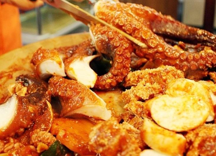 얼얼하게 매운 갈비알찜에는 문어, 갈비, 떡 등 건더기가 푸짐하게 들어간다.