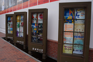 혜화역 입구에 다양한 연극 포스터가 걸려있다.