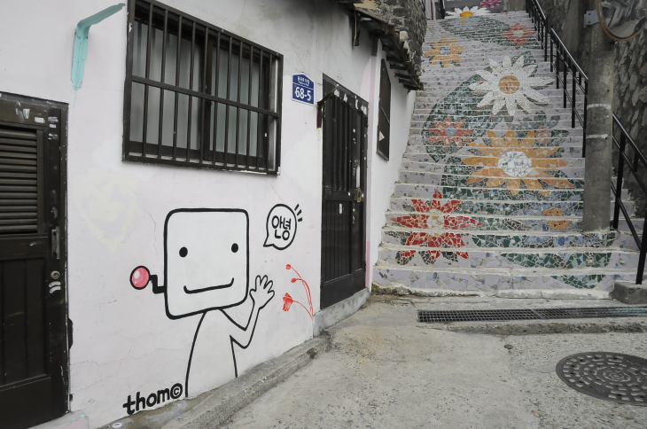 이화동 벽화골목은 꽃 그림 계단을 오르는 것으로 시작된다.