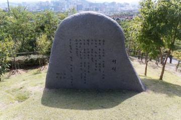 시인의 언덕 꼭대기에는 윤동주 시인의 시를 새겨놓은 석비를 찾아볼 수 있다.윤동주문학관을 나와 위쪽으로 조금만 걸어가면 ‘윤동주 시인의 언덕’이 있다. 누구나 부담 없이 오를 수 있도록 조성된 길을 따라 열심히 걸어가다 보면 살짝 심심함이 느껴지기도 한다. 하지만 고개를 돌려 어느 새 한 눈에 들어오는 서울의 경치를 바라보면 심심함은 잊고 눈앞에 펼쳐진 서울의 모습에 매료될 것이다. 시인의 언덕을 올라가는 길에는 윤동주문학관 카페가 있어 잠시 쉬어가기에도 좋다. 시인의 언덕 꼭대기에는 윤동주 시인의 ‘서시’라는 시가 새겨진 석비가 크게 자리하고 있다. 넓게 펼쳐진 서울의 모습을 배경으로 시를 가만히 읽다보면 남다른 기분에 사로잡히게 될 것이다.