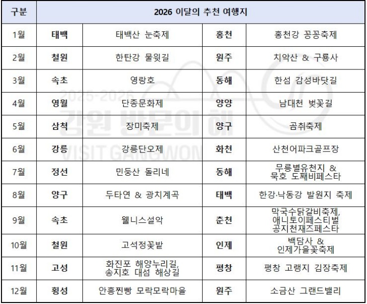 강원특별자치도와 강원관광재단은 ‘2025~2026 강원 방문의 해’를 맞아 2026년 한 해 동안 관광객들에게 강원관광의 사계절 매력을 월별로 집중 조명할 ‘2026 이달의 추천 여행지’ 최종 리스트를 발표했다.