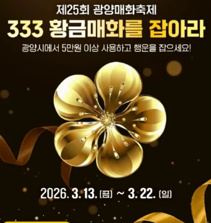 대한민국 봄의 시작을 알리는 제25회 광양매화축제가 다양한 참여형 이벤트를 운영해 관광객들의 기대감을 모으고 있다. 광양시는 축제 기간 동안 총 333만 원 상당의 황금매화를 받을 수 있는 ‘황금매화·매실 GET’ 이벤트를 비롯해 ‘한국관광 100선 탐방’, ‘광양매화 스탬프 투어’, ‘매화길 가벼운 걸음(Fun Run)’ 등 참여형 프로그램을 운영한다고 밝혔다.
