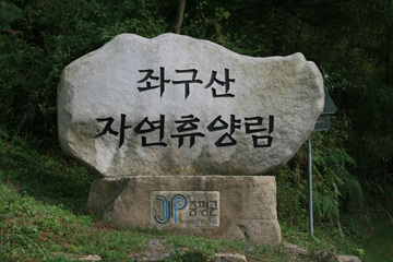 '좌구산자연휴양림'을 알리는 표석이 세워져 있다.2