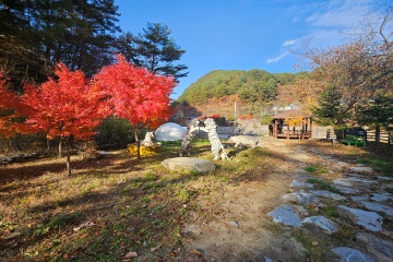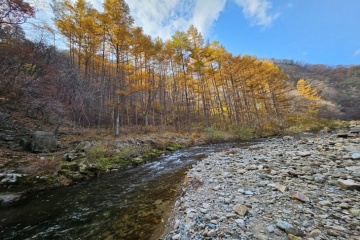 여름과 가을의 정취가 공존하는 육송정 삼거리 물놀이장은 단풍나무로 둘러싸여 한 폭의 수채화를 연상케 한다. 특히 10월경이면 노란 단풍이 계곡 물 위로 비쳐 환상적인 풍경을 자아낸다. 매년 500명 이상의 주민과 관광객이 찾아와 피서를 즐기며, 넓은 주차공간과 간이화장실 등 편의시설도 갖춰져 있다. 사진 속 짙은 단풍빛이 어우러지는 이곳은 석포면이 자랑하는 여름, 가을철 가족 물놀이 명소로 손꼽힌다.
