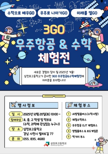 삼천포고등학교(교장 서영희)는 오는 12월 20일 오전 10시부터 교내에서 ‘3GO 우주항공&수학 체험전’을 개최한다.