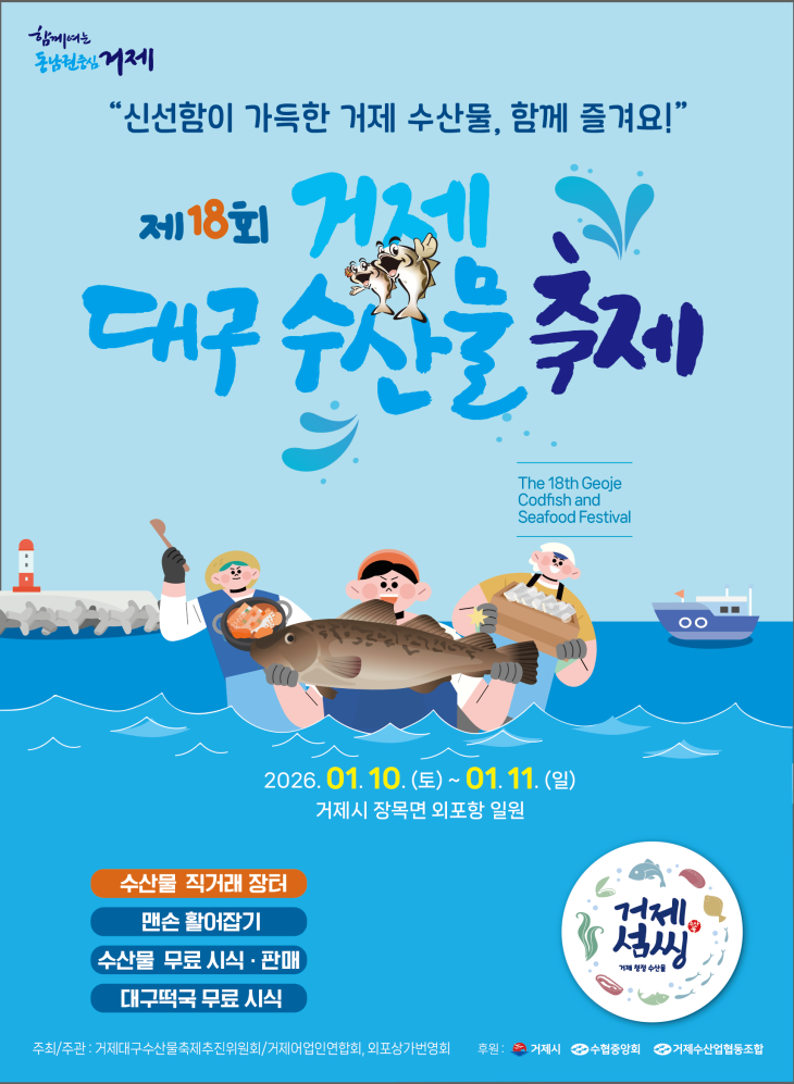 거제시는 지역 대표 겨울철 축제인 거제 대구 수산물 축제를 대구 금어기 이전인 2026년 1월 10일~11일 이틀간 장목면 외포항 일원에서 개최한다고 밝혔다. 매년 12월에 개최하던 축제를 대구 주 어획 시기 변화에 따라 20여 일 늦추어 개최한다.
