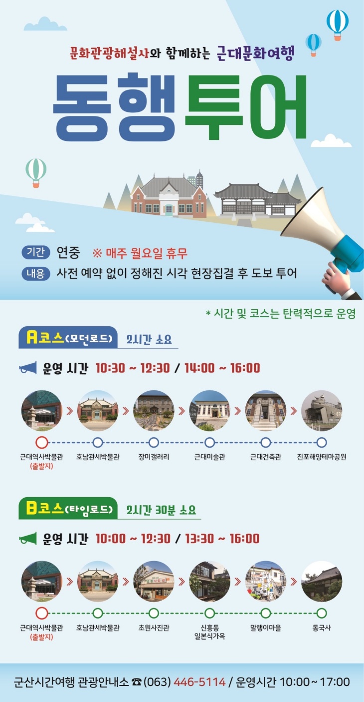 동행투어는 군산의 근대문화 유산이 밀집돼있는 시간여행마을 대표 관광지를 2개 코스(모던로드·타임로드)로 구성해 문화관광해설사가 도보로 동행하며, 해설 서비스를 제공하는 프로그램이다.