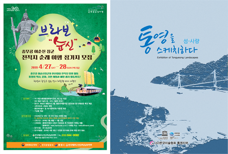2019년 봄 여행주간_ '브라보 순신' 포스터(왼), '통영을 스케치하다 섬-사량' 작품 전시회(오)